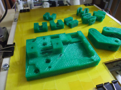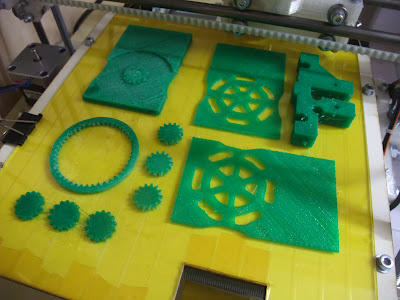 Bon, jusqu’ici j’ai pu imprimer une vingtaine de pièce pour un premier kit reprap, quelques autres trucs et beaucoup de chutes (que je garde pour quand on aura une recycleuse afin d’en refaire du fil^^)